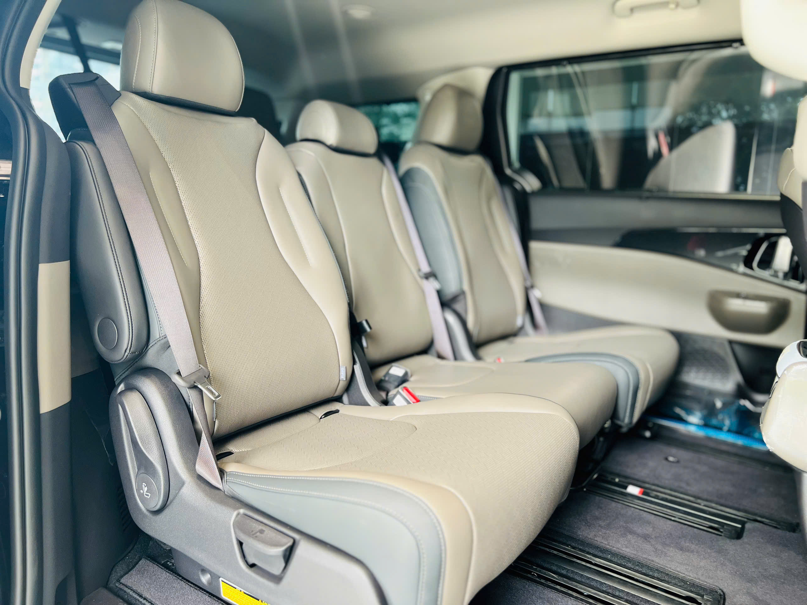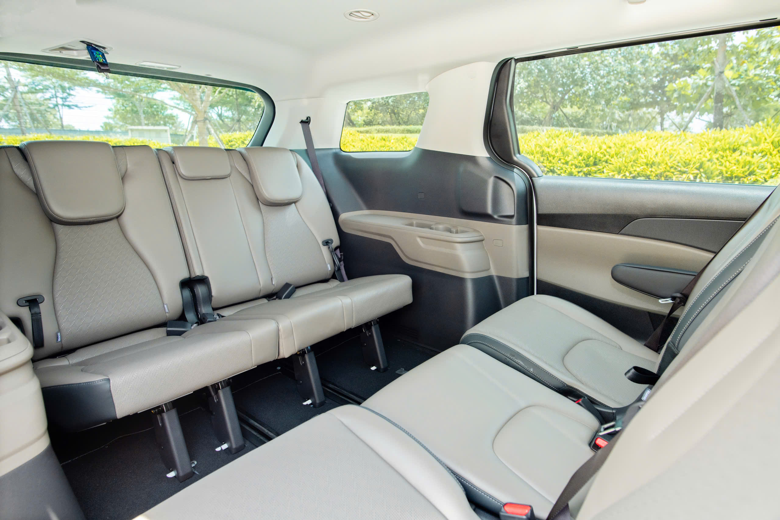 Bên cạnh đó, hàng ghế 3 trên Kia New Carnival được nhiều khách hàng đánh giá cao khi có thể điều chỉnh góc ngả lưng lên đến 120 độ hoặc gập phẳng giúp gia tăng không gian chứa đồ. Hàng ghế này có khoảng để chân rộng và khoảng sáng trần lớn, tạo không gian ngồi thông thoáng, thoải mái.