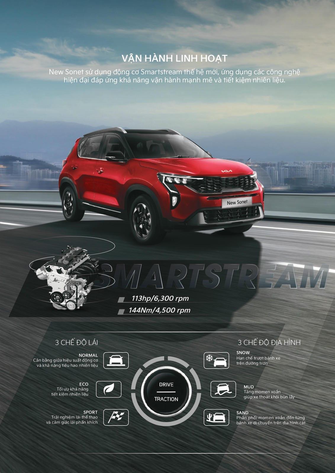 KIA Sonet 2024 được trang bị động cơ xăng Smartstream, dung tích 1.5L, sinh công suất lớn nhất 113 mã lực và mô-men xoắn cực đại 144Nm. Kết nối với đó là hộp số sàn 6 cấp hoặc tự động vô cấp CVT. Trên các bản Luxury và Premium xuất hiện thêm tính năng thay đổi chế độ lái.