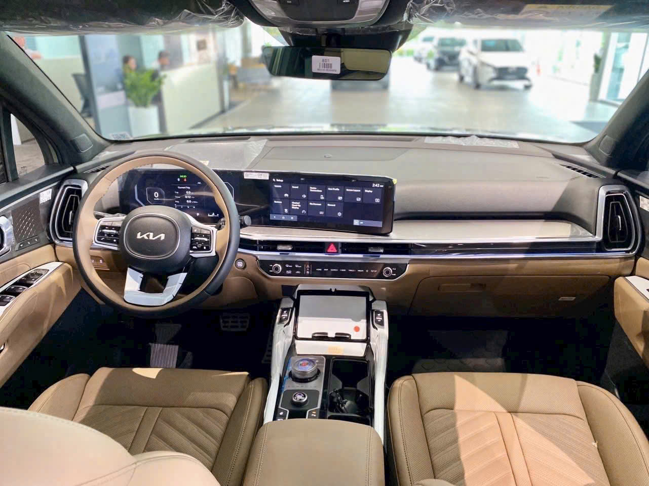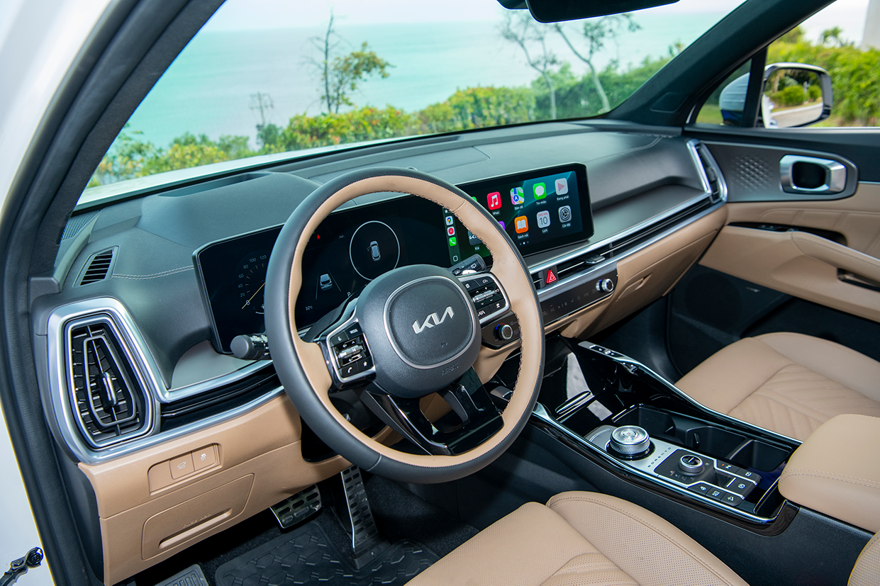 Nội thất Kia Sorento 2025 nâng cấp đáng kể với cụm hình cong sau vô lăng, đều có kích thước lớn 12,3 inch. Khu vực điều khiển trung tâm được thiết kế lại gọn gàng, đi kèm phím bấm điện tử thay cho cần số truyền thống. So với Sorento cũ vốn chỉ có màn hình 10,25 inch và bảng táp-lô đơn giản, phiên bản mới mang đến cảm giác hiện đại hơn.